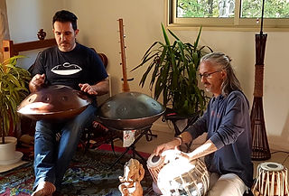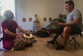 Emmanuel joue du HandPan et moi, je serai au tabla (percussions indiennes) et Udu (Percussion africaine).
